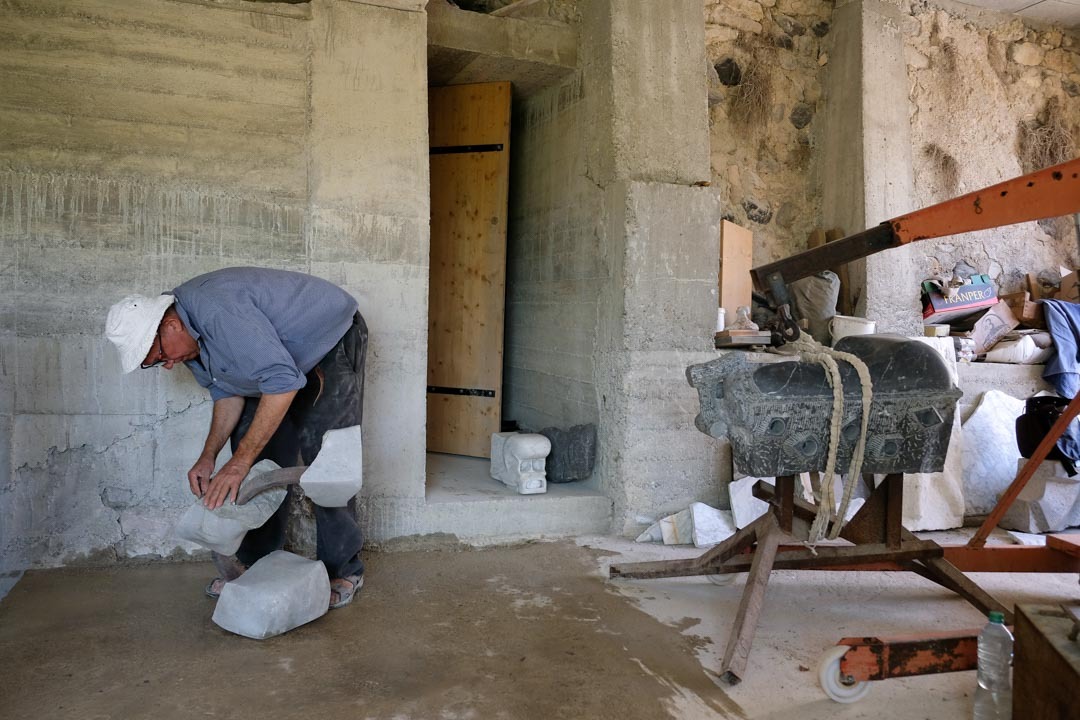 pierre; Aime; acier; sculpture; pièce unique; marbre; blanc; atelier; in situ; Blaise Charlet; sculpteur;